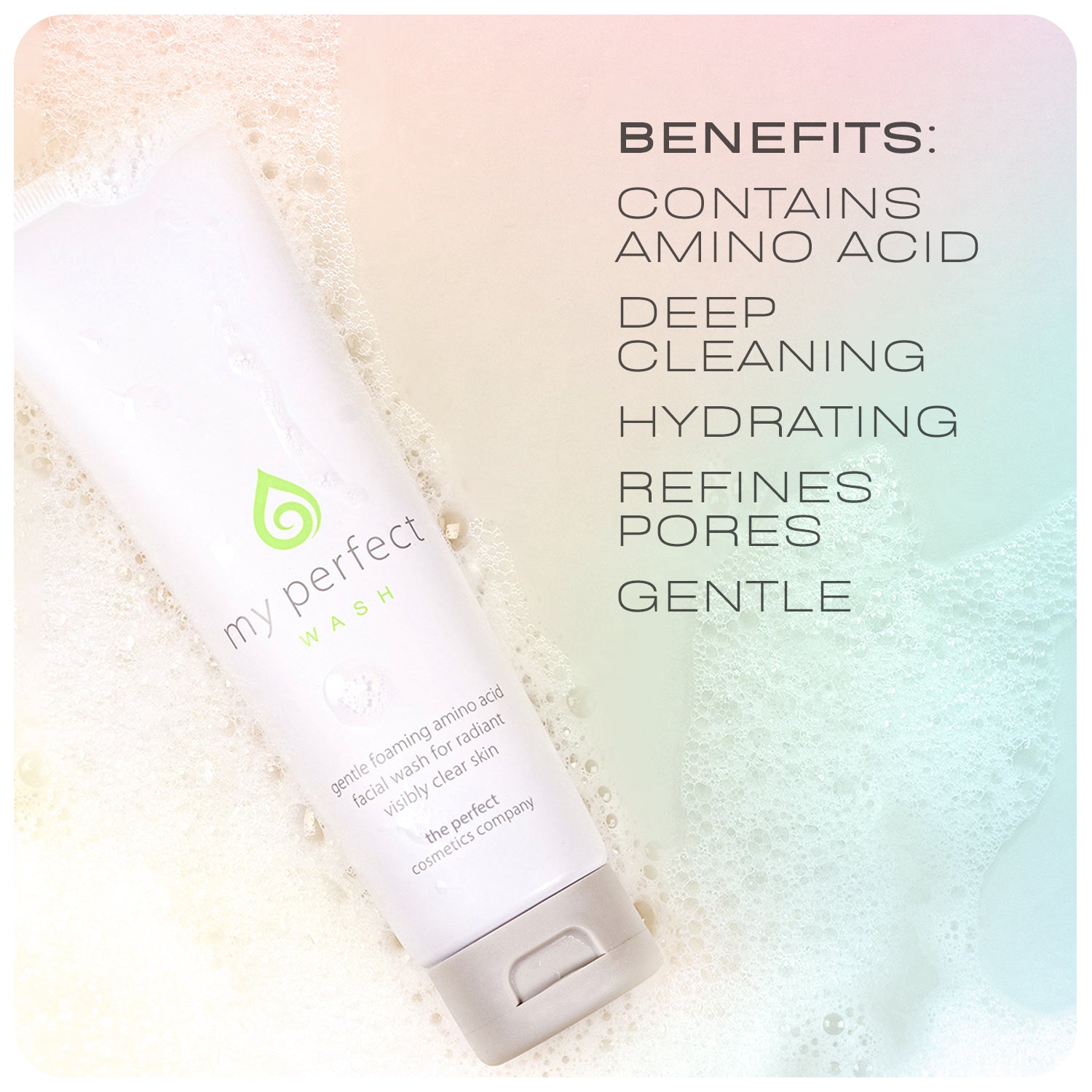 - Gentle Cleansing: My Perfect Wash's amino acid formula removes makeup and impurities while hydrating skin. Paired with My Perfect Serum, your skin will feel softer, smoother, and refreshed.