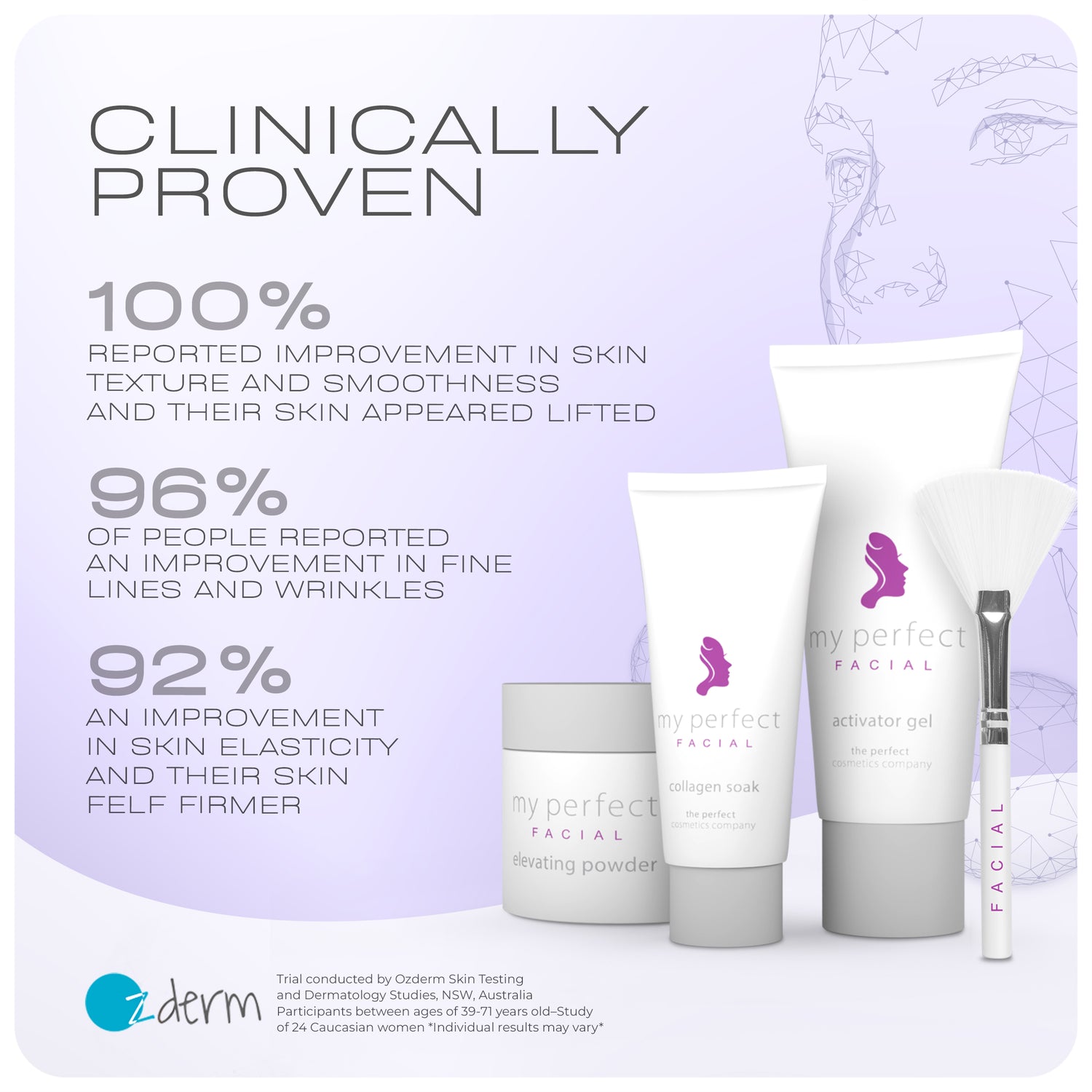 My Perfect Facial is backed by clinical results. It is a full facial contouring system that is scientifically proven to lift, tone, tighten and firm the skin while simultaneously softening facial lines and wrinkles and smoothing the skin of the face, neck and decolletage. Formulated with active anti-ageing ingredients, it contains protein dissolving enzymes that melt away dead skin cells revealing a brighter, tighter and more radiant complexion. Skin tone appears more even and surface damage repaired.