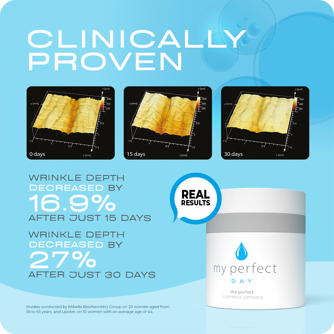 My Perfect Day cream is a light yet powerful day cream, clinically proven to deliver effective anti-ageing results. Thanks to the inclusion of Acetyl Hexapeptide-8 (Argireline Peptide), it targets fine lines and wrinkles, especially expression lines, by gently reducing muscle movement. This unique peptide action, combined with nourishing Vitamin E and deeply hydrating Squalane, enhances skin firmness, smooths texture, and improves resilience. Clinically tested to be both gentle and effective, My Perfect Day provides lasting hydration and a visibly firmer, more radiant complexion, an ideal choice for daily, non-invasive anti-ageing care.